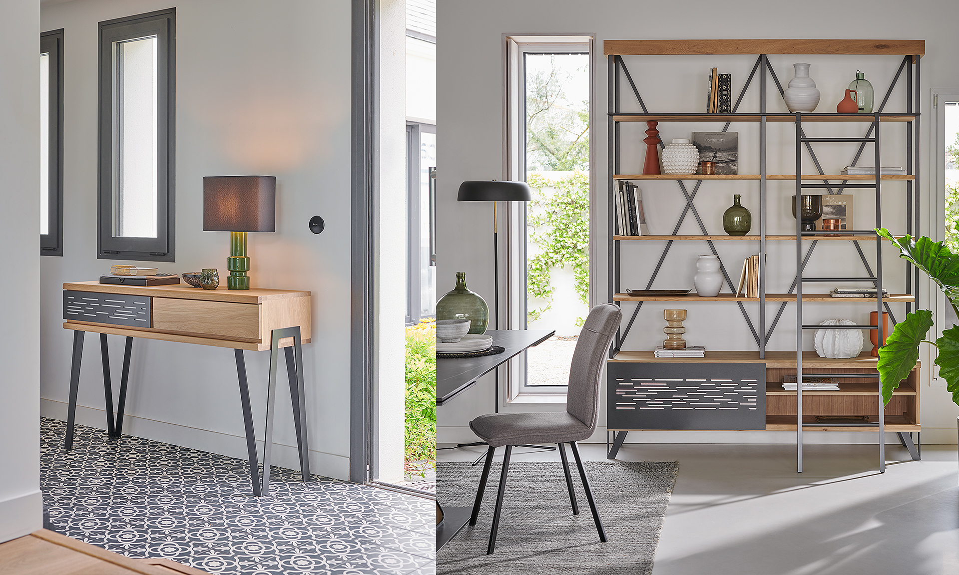 Meubles dessus, façades, côtés chêne massif. Étagères panneau de particules placage chêne. Cadre côté et pieds métal. Portes battantes et coulissantes métal et chêne massif. Tiroir chêne massif sur coulisses invisibles avec amortisseurs. Tablette verre épaisseur 8mm. Roulettes PVC. Option spot éclairage chaud.