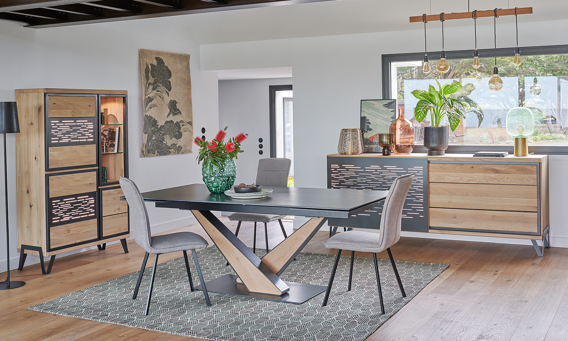 Table plateau et allonges chêne massif. Pieds métal et chêne massif. Coulisses métal.