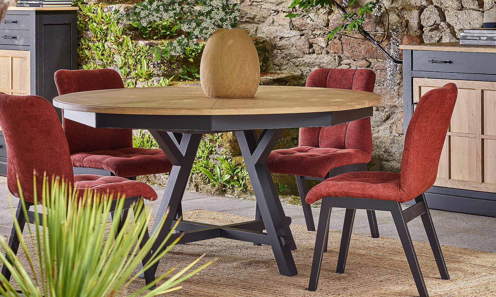 Table ronde 150×150 H.77 cm – 1 allonge portefeuille 60 cm
