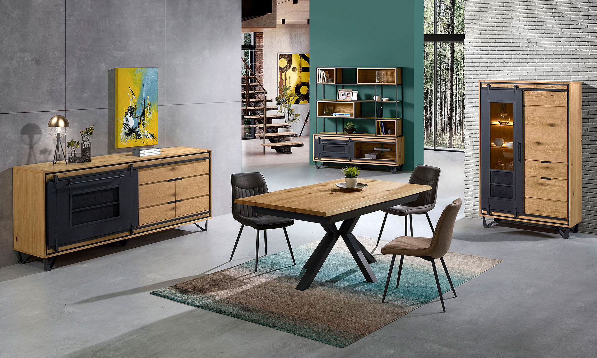 Portes, façades, côtés, dessus, derrières, séparations, fonds, caissons et tablettes panneaux de fibres moyenne densité revêtus de placage chêne. Table de repas 4 pieds, piètement chêne massif. Table de repas pied central, piètement métal. Traverses, structure intérieure hêtre massif. Plateaux et allonges bois massif latté alaisé chêne massif, revêtus de placage chêne.
