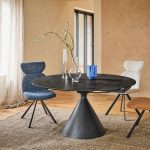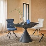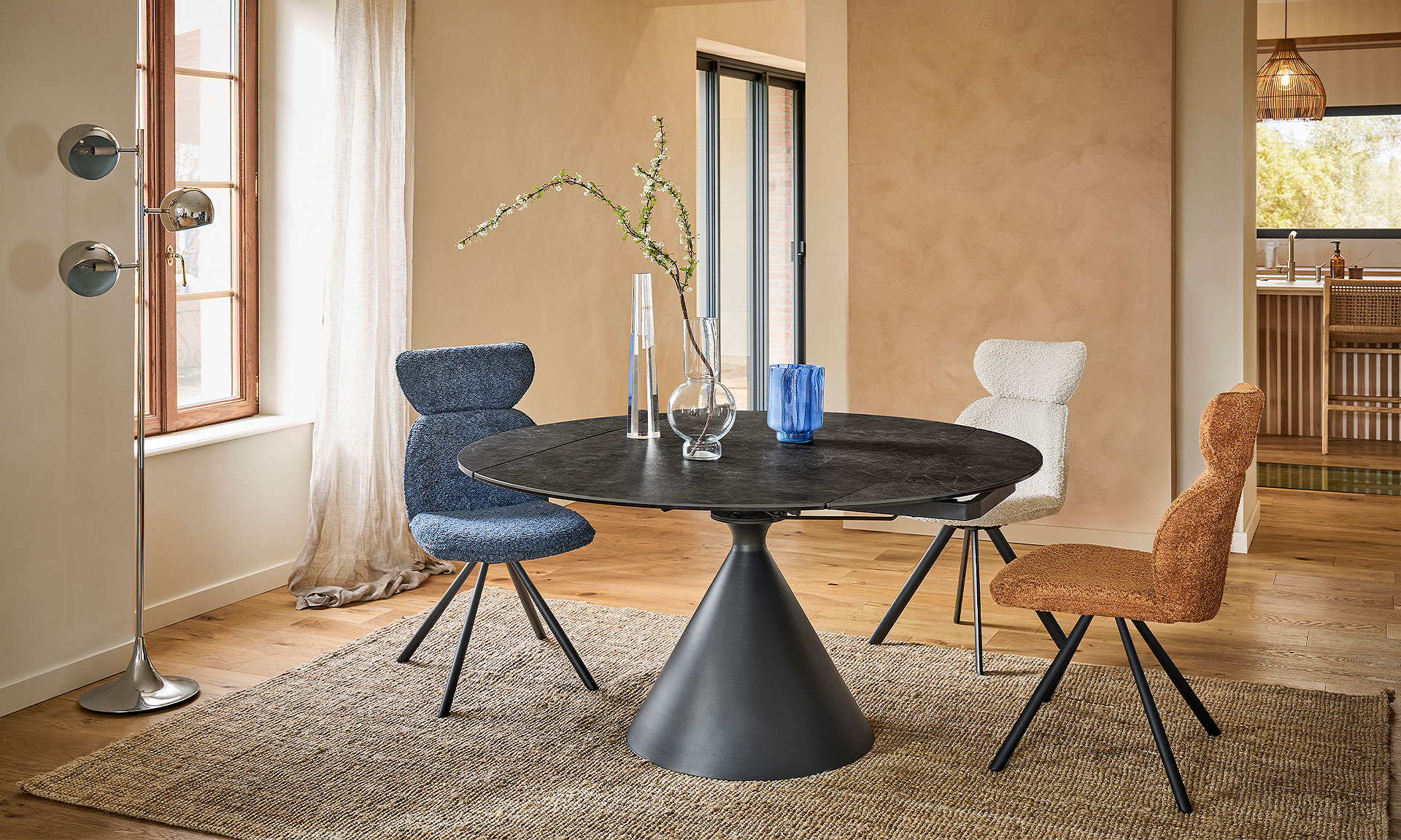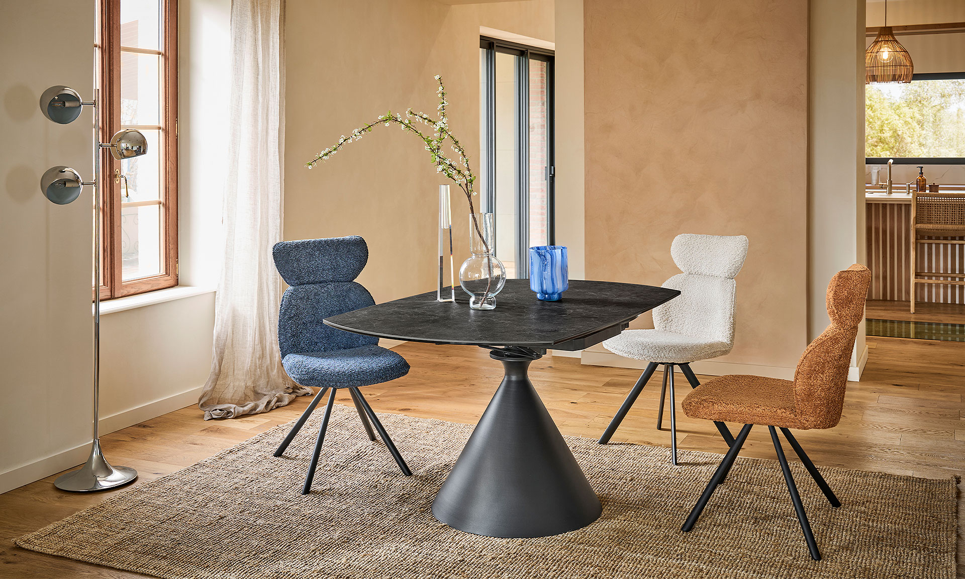 Céramique épaisseur 3 mm collée sur verre épaisseur 8 mm. Finition céramique noir marbré ou quartz. Piètement métal. Deux allonges en bout escamotables par rotation du plateau à 180°.